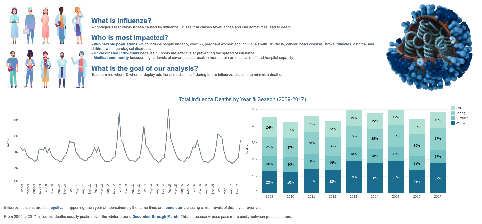 Influenza seasons are cyclical, peaking each year from December to March, and consistent, causing similar levels of death year over year.